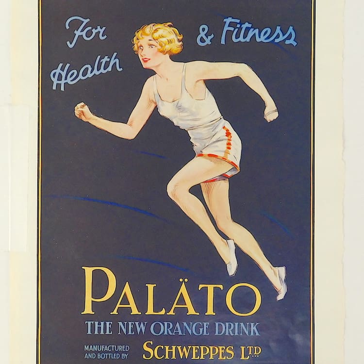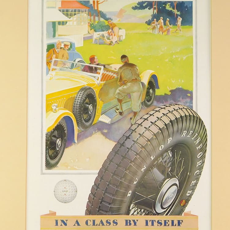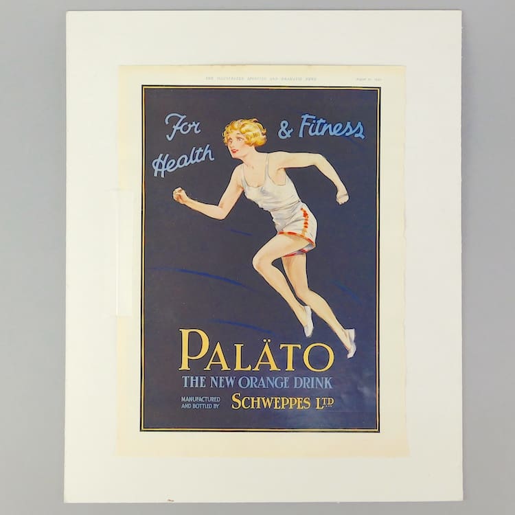 This is a page from The illustrated sporting and dramatic news August 1922. On one side is a print of 1920s golfers with a car advertising Dunlop tyres and to the reverse a female runner advertising Scwepps Palato orange drink.