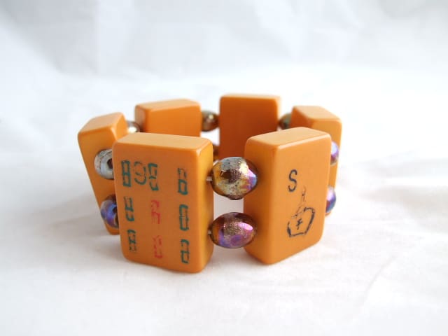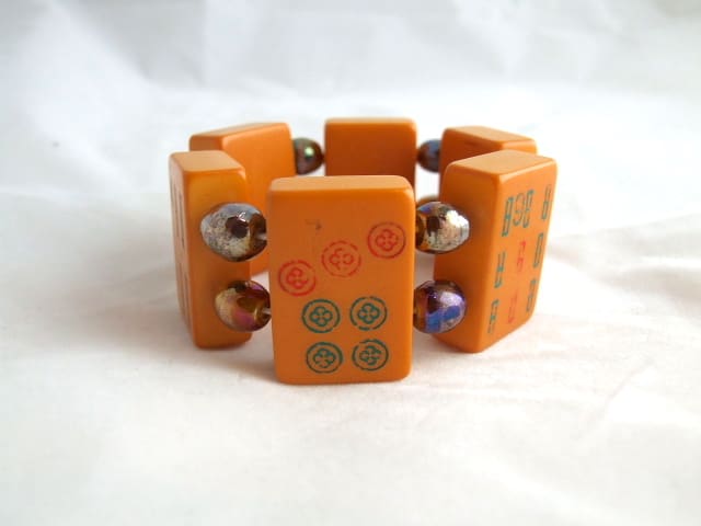 Vintage Mah Jong elasticated bracelet. Made out large vintage phenolic panels interspersed with metallic glass beads.