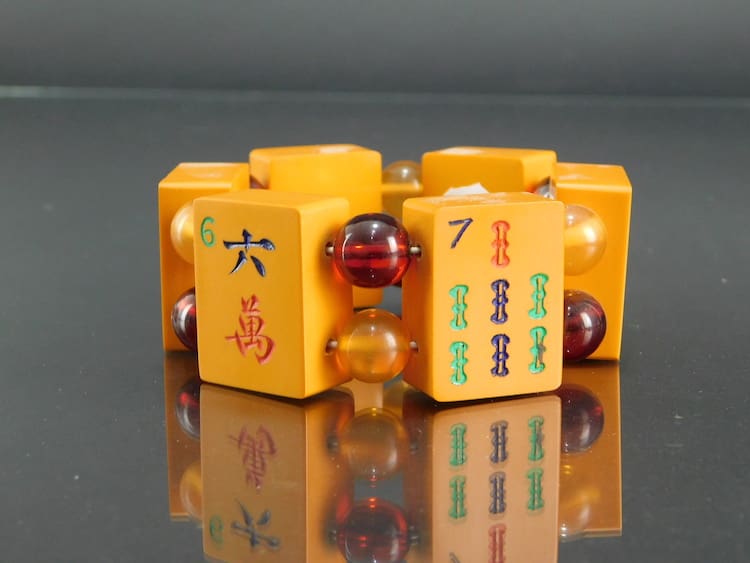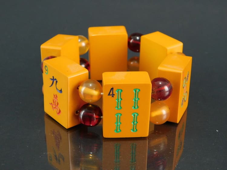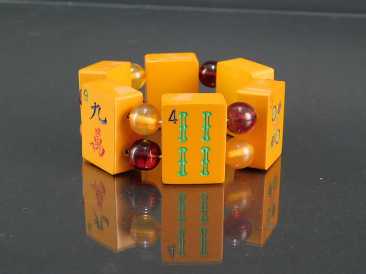 Vintage Mah Jong elasticated bracelet. Made of large vintage phenolic panels interspersed with red and yellow beads.