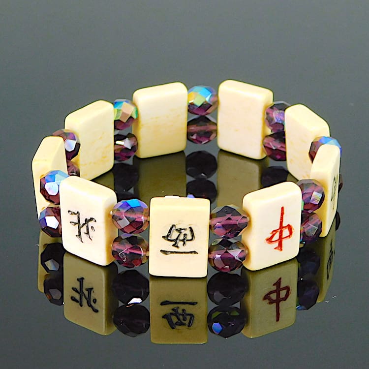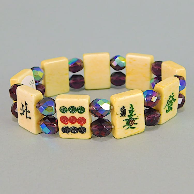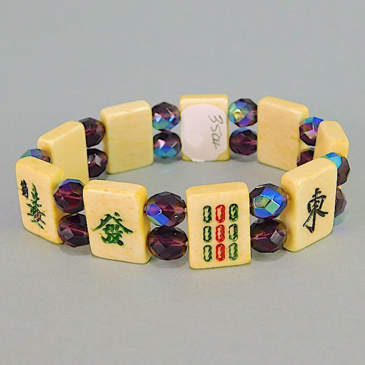 Vintage Mahjong elasticated bracelet. Made of large vintage phenolic panels interspersed with metallic glass beads.