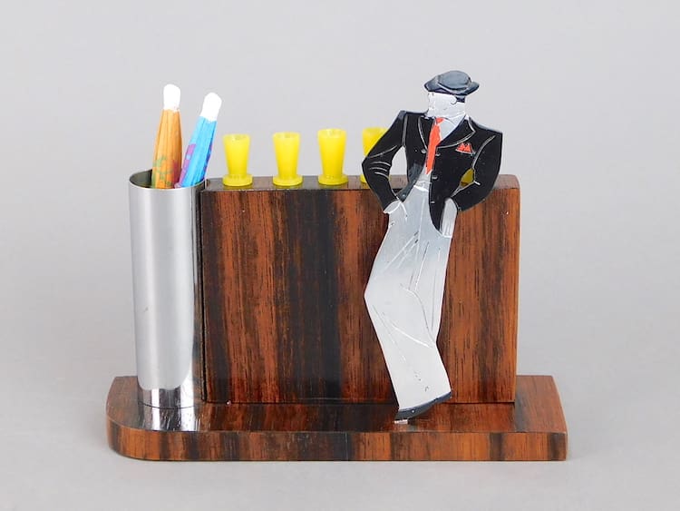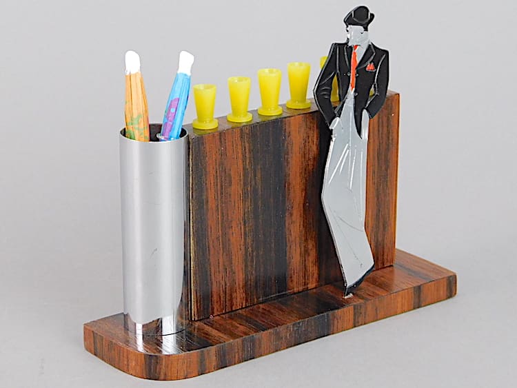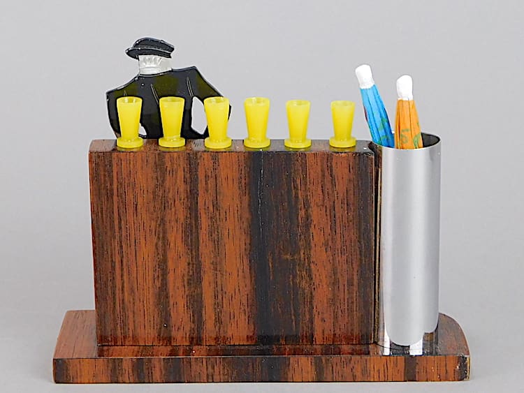 Stylish art deco man posing at a bar. To the top of the bar are 6 phenolic glasses which are the cocktail sticks. The bar is made of Macassar wood and to one end is a chrome container for straws or swizzle sticks, shown with 2 umbrella sticks. It is an unsigned Sudre.