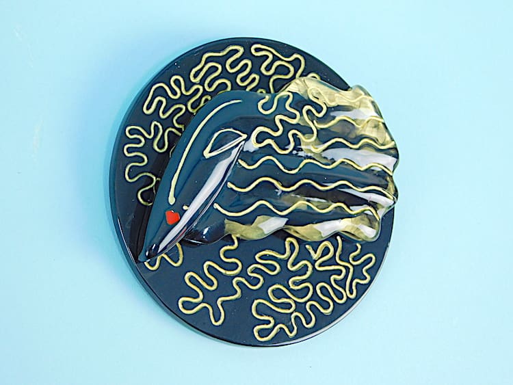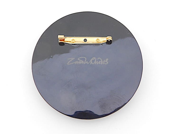 Black and gold hand painted phenolic art deco famous Manhattan head brooch. Signed to the back Zandra Rhodes and it still has its original pink satin gift pouch.