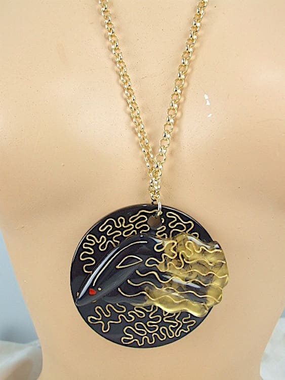 This ladies head pendant necklace is known as the Manhattan design. It comes complete with a signature to the back of the pendant, with its original tag and silk gift bag. The disc hangs on a gilt metal chain that can be hung at any length you wish.