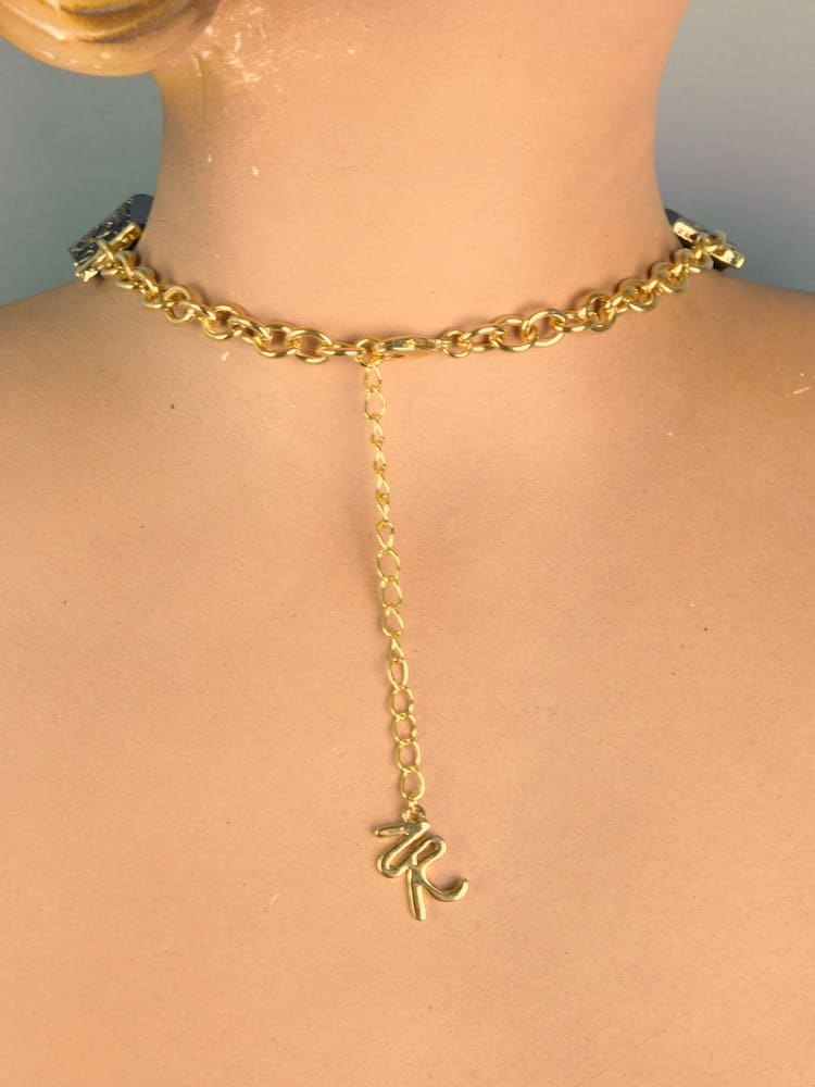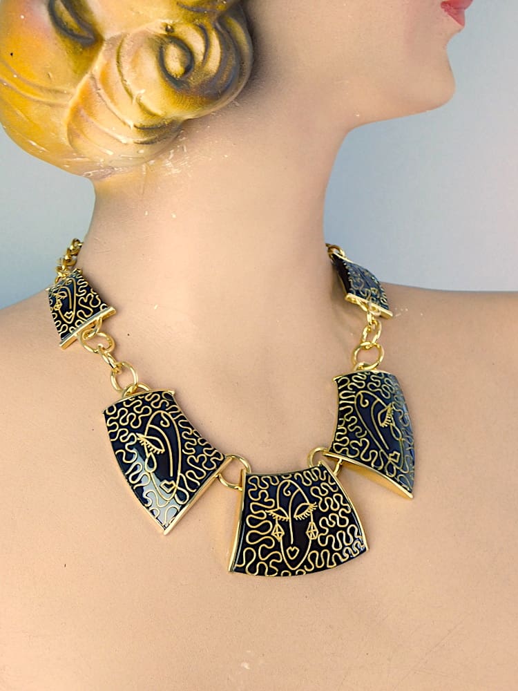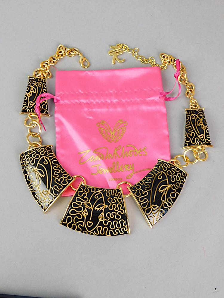 Vintage ZR Dark brown and gold phenolic necklace, with the ZR famous Manhattan faces on it – no longer in production. Comes with its original pink ZR pouch.