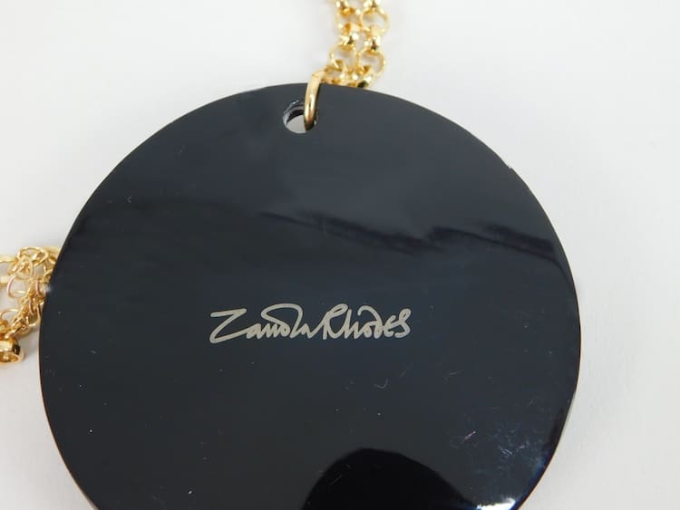 Vintage black and gold hand painted phenolic art deco famous Manhattan head pendant necklace. Signed to the back Zandra Rhodes. Comes with its original pink satin gift pouch.