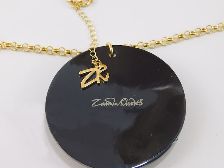 Vintage black and gold hand painted phenolic art deco Manhattan pendant necklace. Signed to the back Zandra Rhodes and comes with its original pink satin gift pouch.