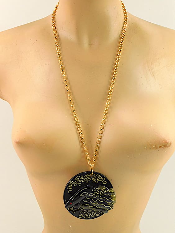 Vintage black and gold hand painted phenolic art deco famous Manhattan head pendant necklace. Signed to the back Zandra Rhodes. Comes with its original pink satin gift pouch.