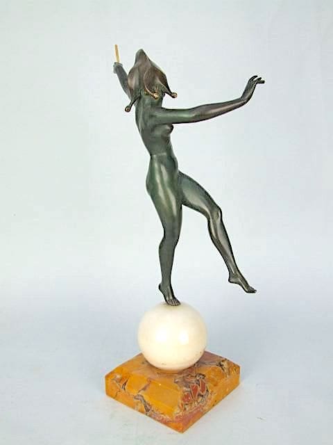 Top quality green patinated French art deco bronze female wearing a jesters hat and holding an ivory baton. Signed Bouraine to the marble plinth and produced by the Etling Foundry.