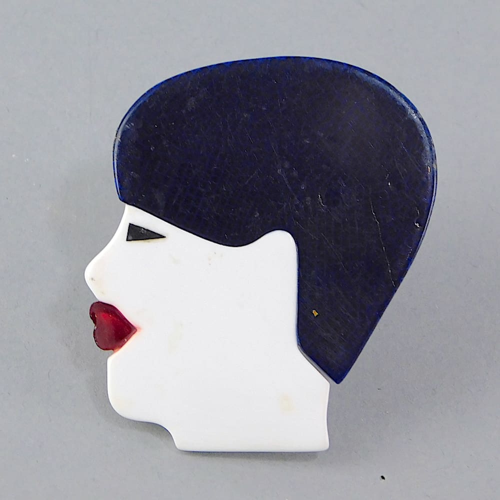 This is the very early first edition art deco lady (Marcelle) brooch. An unsigned Lea Stein fitted with a bar roll safety clasp.
