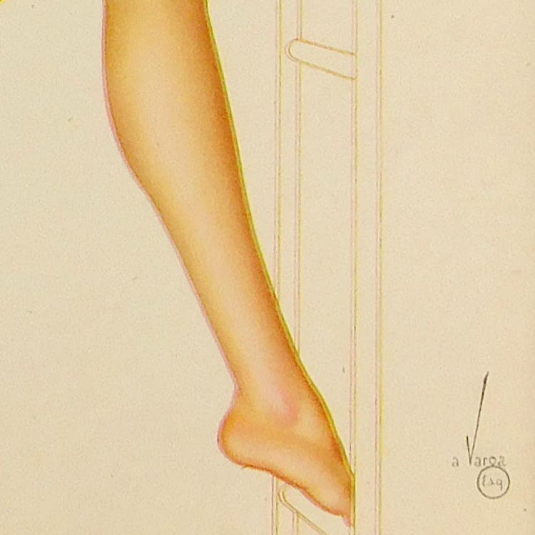 Genuine vintage calendar girl by Alberto Varga from a 1946 calendar. Currently unframed but mounted in a pale peach board frame. Artwork by Varga and verse by Phil Stack.