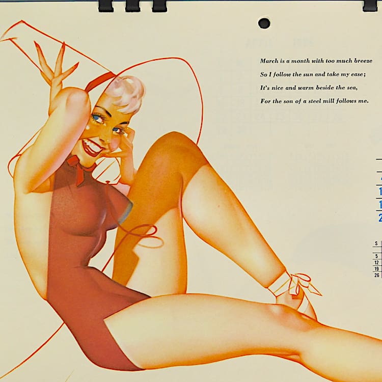 George Petty calendar girls page. Ideal for framing as a group as I have many Petty. Varga and other artists calendar girl pages. This one dates to 1956 and is March.