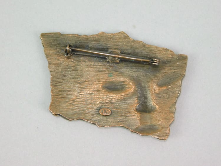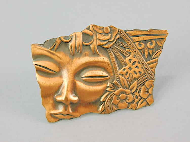 Vintage coppered metal mask brooch. Made by the Jonette Jewellery (USA) signed JJ on the back. Fitted with a roll clasp.