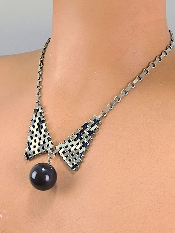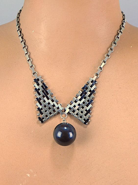Typical Bengel brickwork necklace with black and blue enamel painted patterning and central black galalith ball. Made by Jakob Bengel in the early 1930’s. Similar collar and tie necklaces can be viewed in the first Bengel book on page 123.