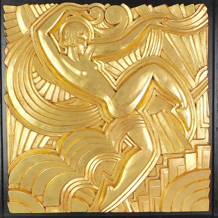 This plaque is made of Gesso (plaster) and is made from a cast which was taken from the entrance porch of the Folies Bergere building in Paris in 1926, which depicts the dancer Nina Nickolska. The original is of concrete and was designed by Maurice Picaud. These plaques were made in a limited number for commemorative purposes and distributed as gifts to the members of Pico’s family, and apparently for sale to patrons of the theatre. It is gilded in very high relief, and is mounted in a heavy quality frame of oak.