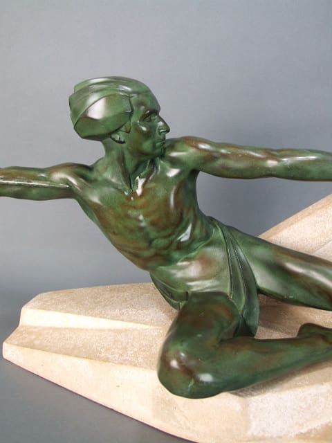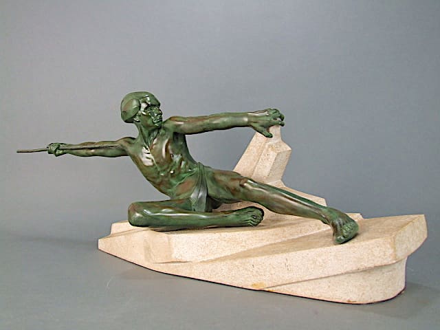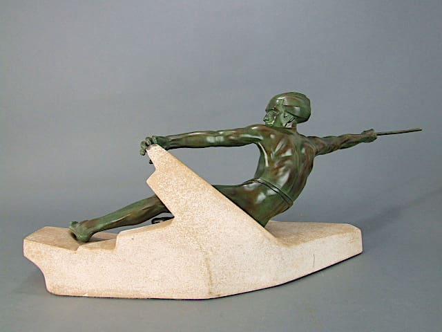 A French art deco statue by Max Le Verrier called Ambuscade. He is mounted on a stone base which is signed to the back.