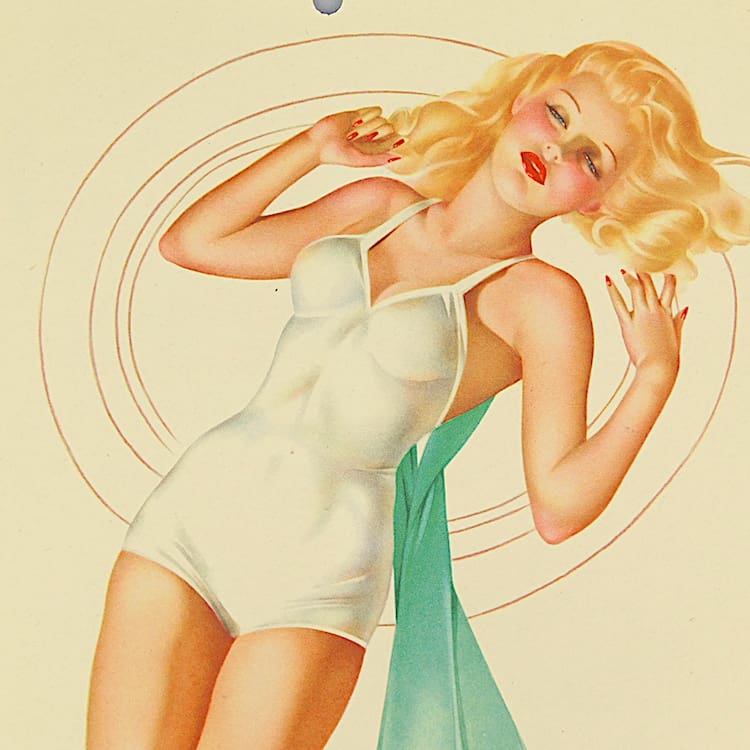 This is an original pin up girl from a vintage Esquire Girl calendar. Artwork by Alberto Varga with the printed signature to the bottom and verse by Earl Wilson.
