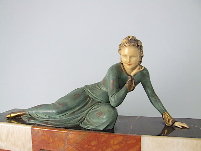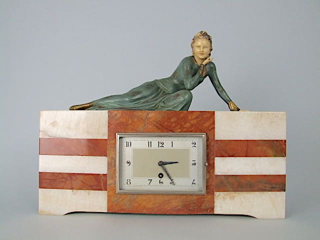 An unsigned Spelter and ivoreen lady clock set by Menneville.