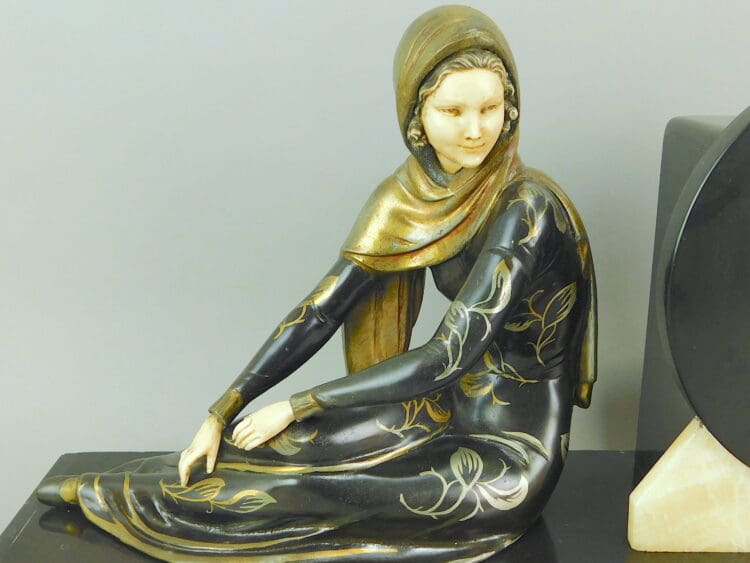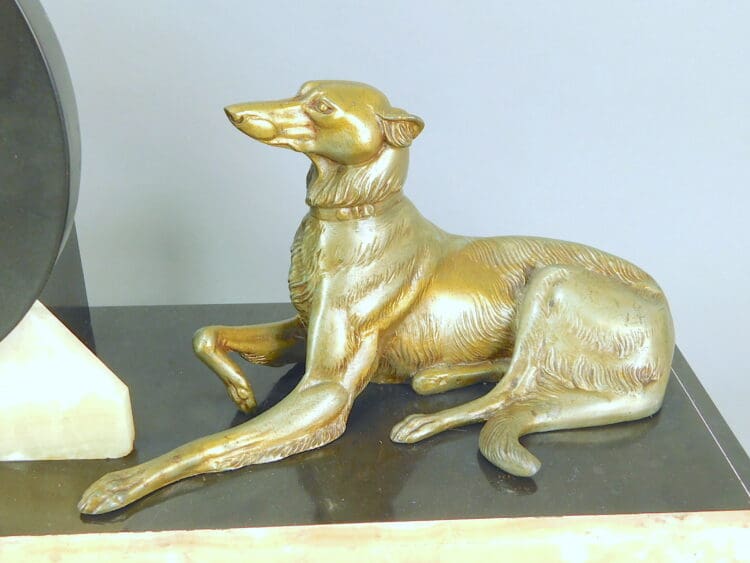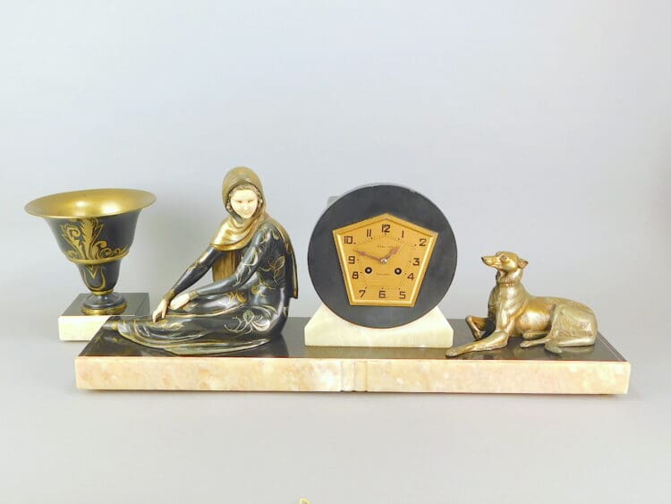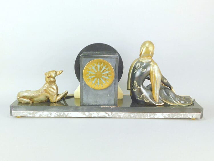 An unsigned French spelter and ivoreen clock set with a gold detail lady and borzois dog complemented by the two usual Menneville urn side pieces.
