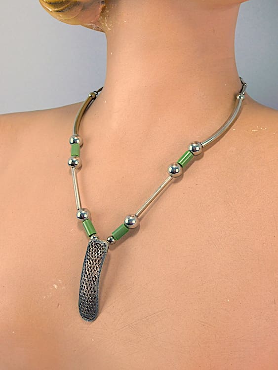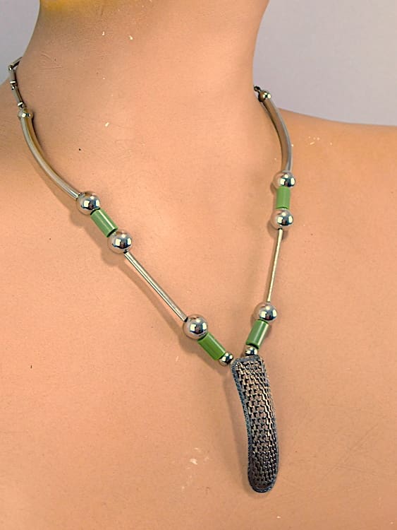Unusual green galalith and chrome chain necklace with unusual central mesh section. Made in the early 1930’s by Jakob Bengel.
