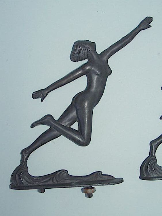 French metal 2-dimensional plaques depicting dancers mounting bolts beneath. Possibly removed from a piece of furniture or mirror. There are two of these but both face the same way.