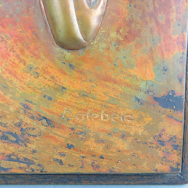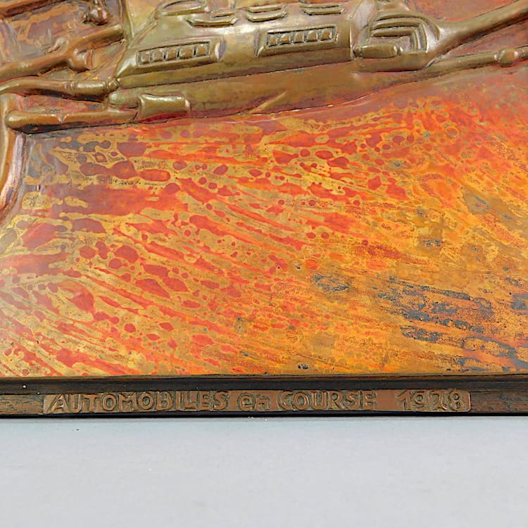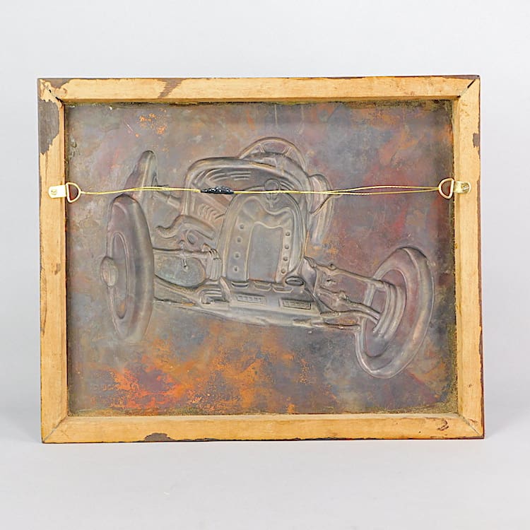 French art deco tin plate moulded metal racing car panel. Wooden outer frame and stamped Balebela to the bottom right hand corner.
