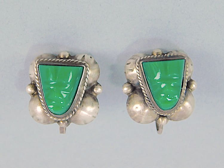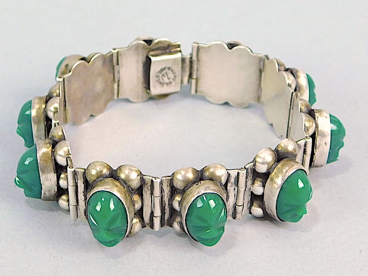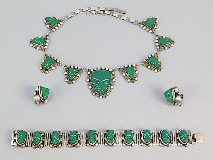 Three piece set made by Taxco in the 1930’s with green galalith masks and Mexican silver panels. The set consists of a necklace, a bracelet and a pair of screw on earrings to match. Stamped Sterling Mexico to the bracelet clasp and the necklace.