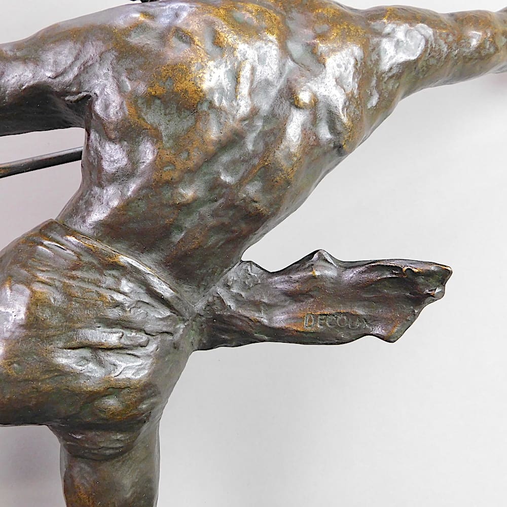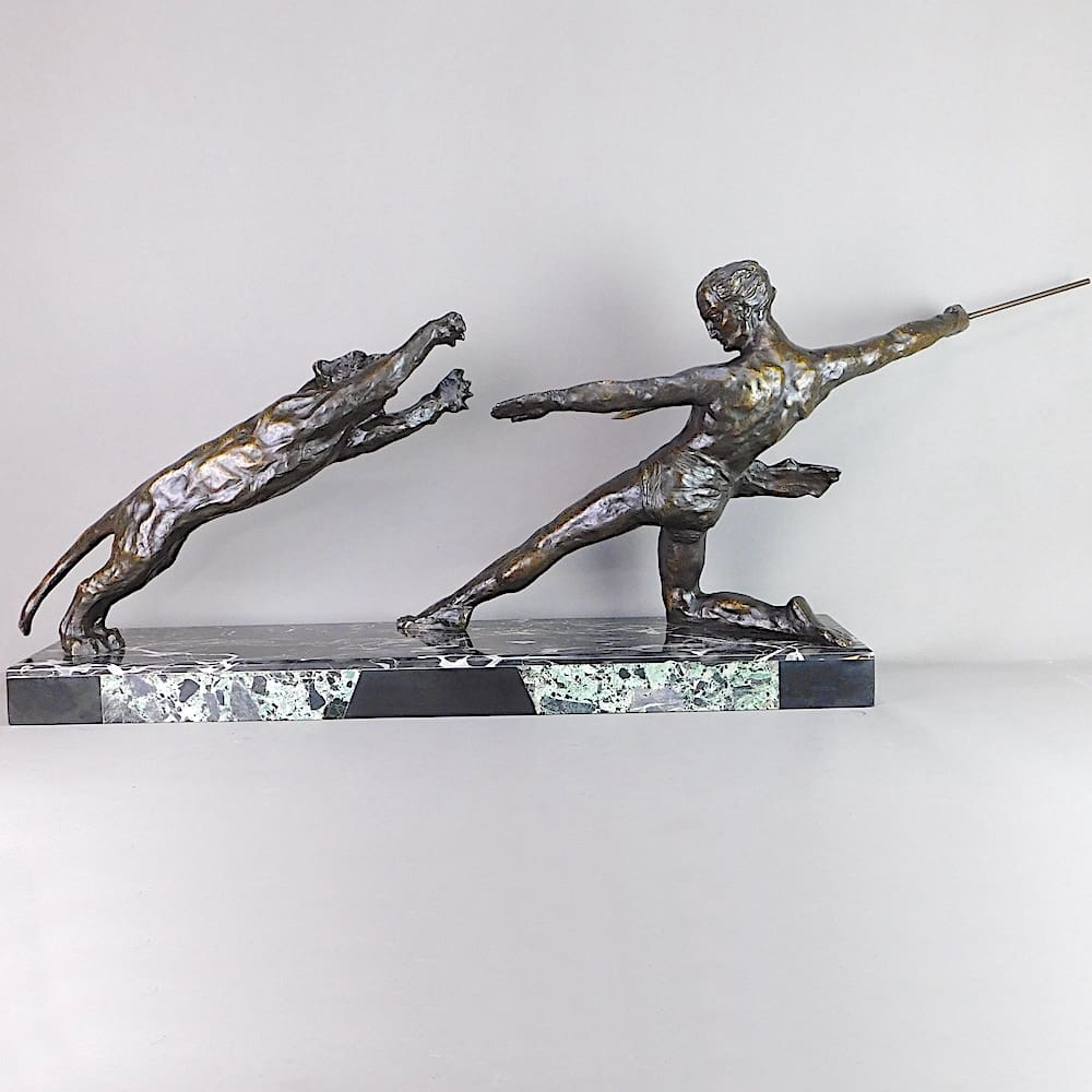 Very large bronze and marble group by Michel Decoux mounted on a black and verdigris marble base.
