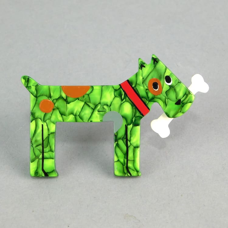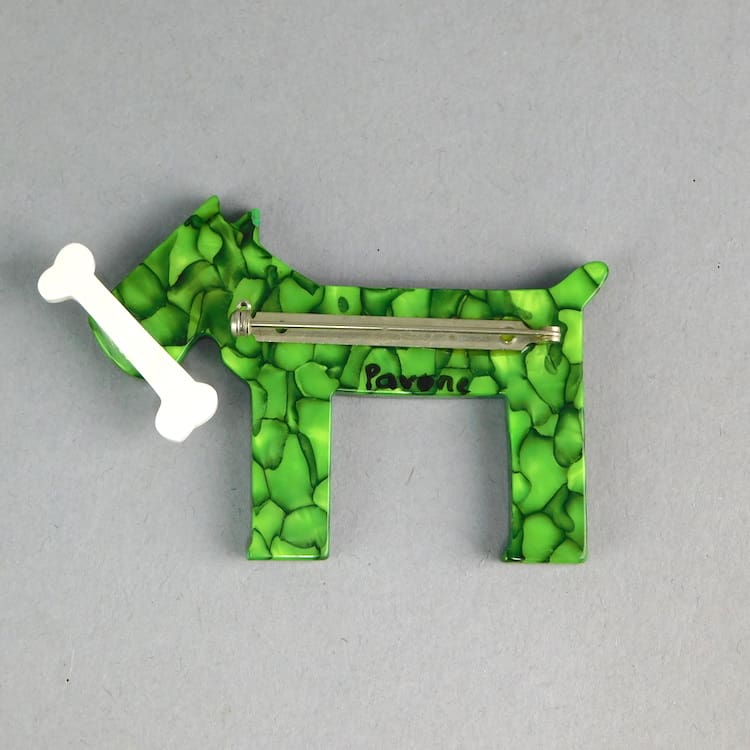 Cute hand painted spotty dog with a bone brooch. Made from vintage bakelite, hand painted and signed by Pavone. Fitted with a roll safety clasp.