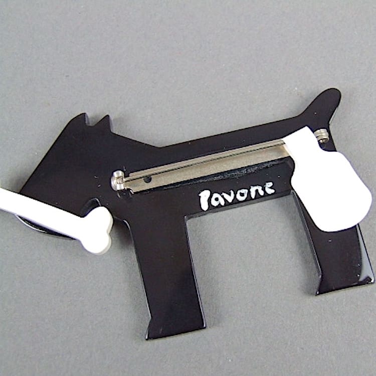 Cute hand painted spotty dog with a bone brooch. Made from vintage bakelite, hand painted and signed by Pavone.