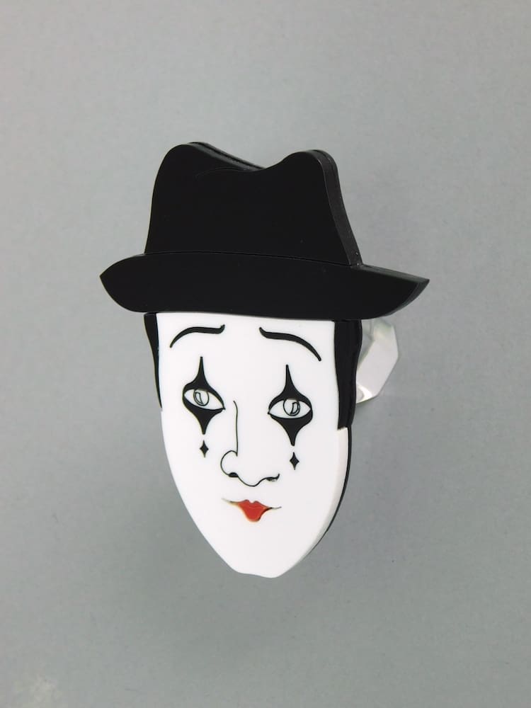 Hand made art deco phenolic resin brooch of a Mime artist. Fitted with a roll safety clasp.
