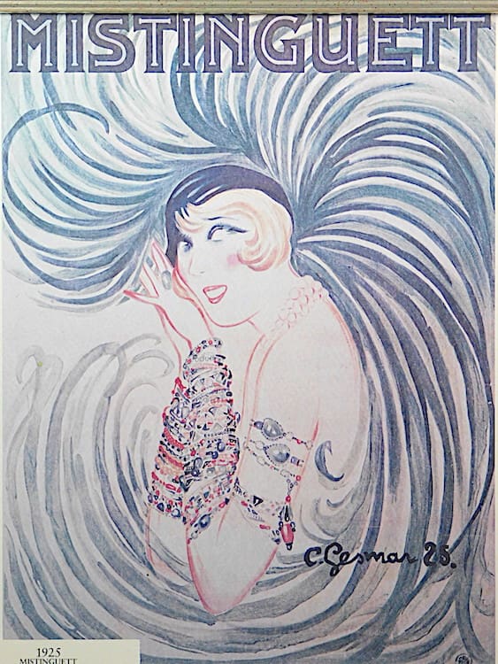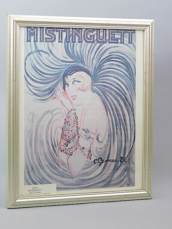 Framed print in a modern silver wooden frame and bearing a label 1925 Mistinguett par C. Gesmar. Can be wall hung or has an easel back so can be stood up.