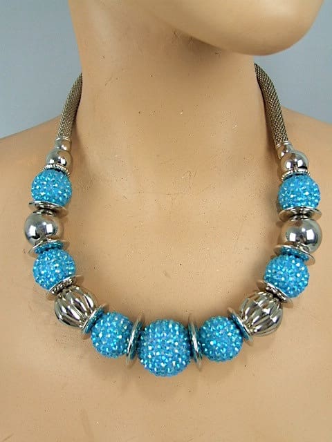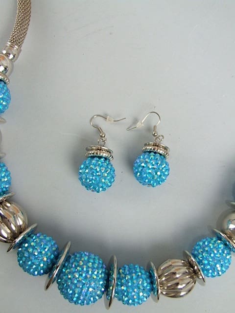 A modern necklace and earrings set with chromed metal snake chain necklace, chrome balls and turquoise blue bead detail. The matching earrings are included.