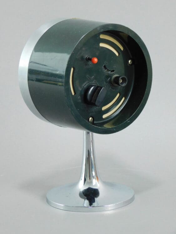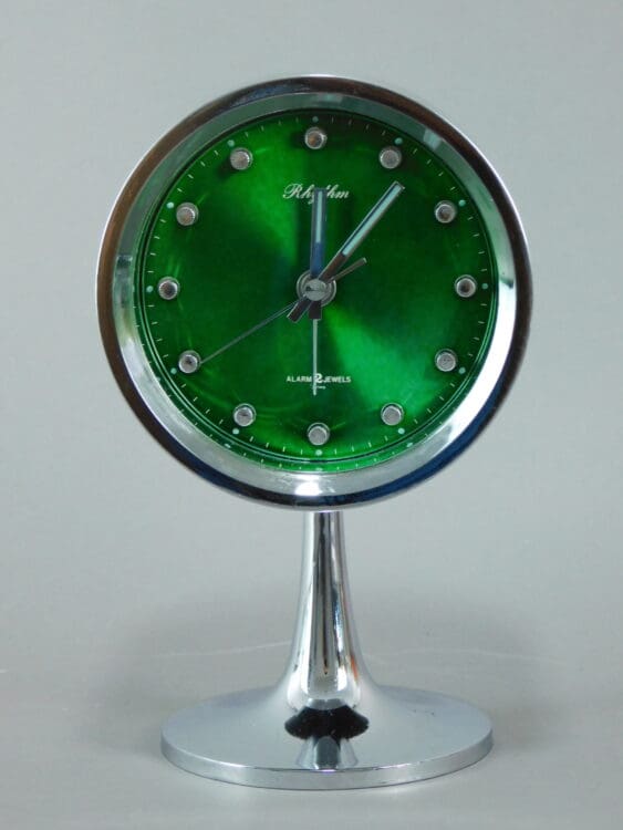 Rhythm alarm clock, made in Japan. It has a black plastic case and metallic green face with silver numerals. Hand wind with bell ring alarm.