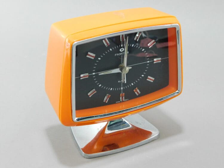 Frontier alarm clock, made in Korea. It has a orange plastic case and metallic black face with silver numerals.
