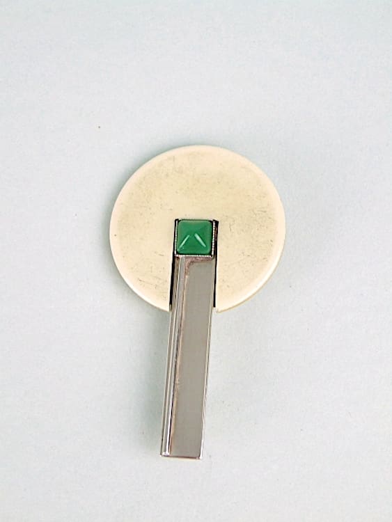 French art deco modernist silvered metal brooch with original 1930s findings in cream and green onyx. Fitted with a roll safety clasp.