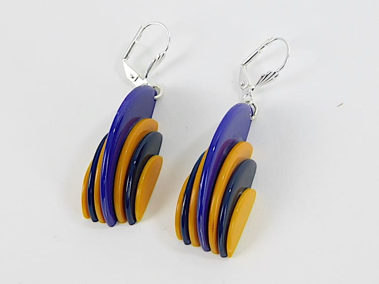 Modernist Art Deco vintage phenolic disc earrings for pierced ears. Purple, orange and black galalith with new silver hooks.