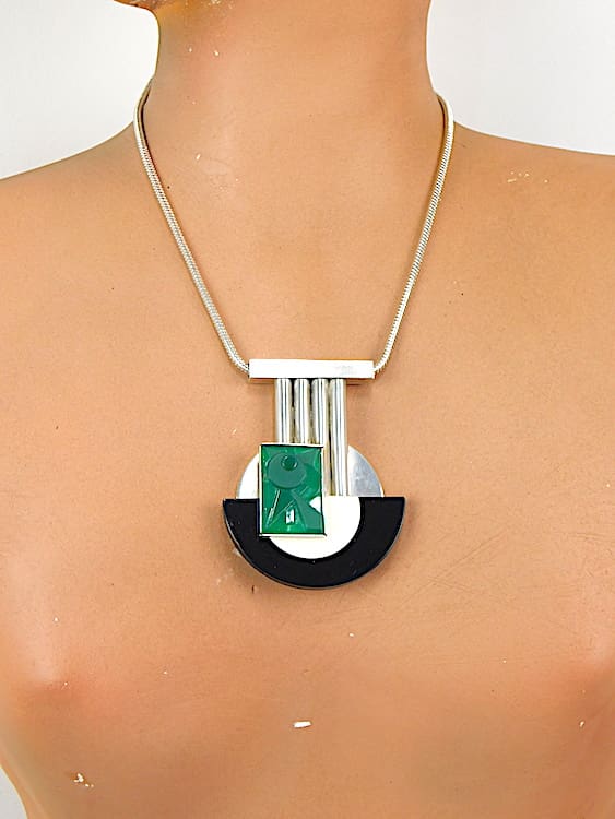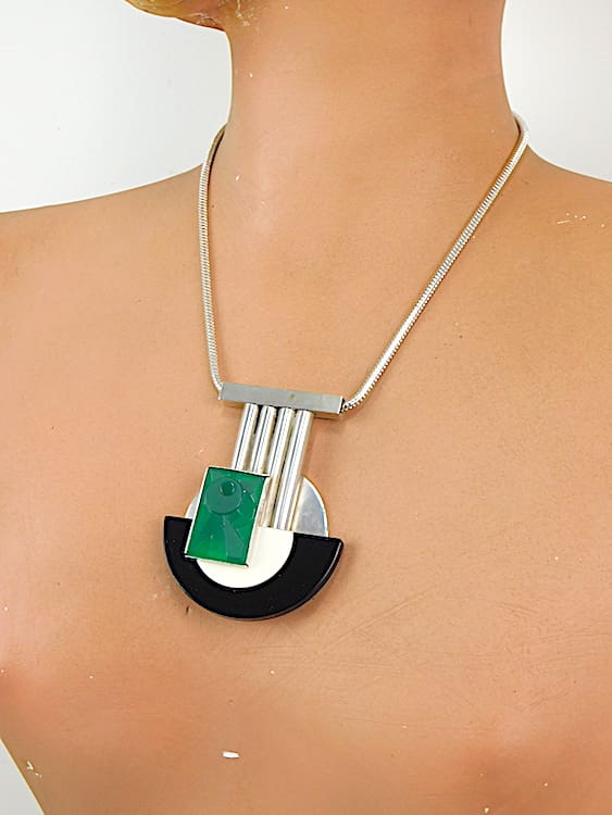 French modernist asymmetrical necklace with black and cream phenolic central semi circular panel and geometric green glass panel. Hung on a silver plated snake chain.