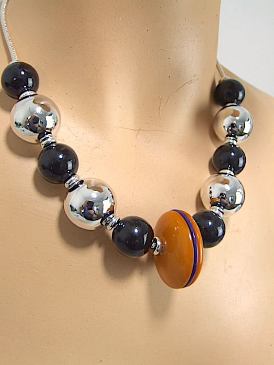 Modernist French art deco necklace in chrome and orange and purple galalith central disc.