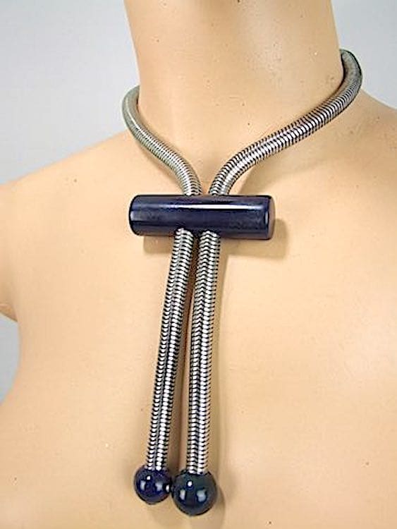 Navy blue galalith and chrome chunky snake chain necklace, made in the early 1930s but the Jakob Bengel company. The central bar measures 2.25 inches (5.5cm) wide. The chain slides up inside the bar for adjustable position.