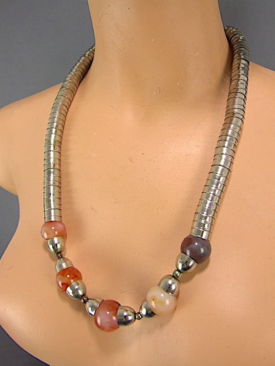 Chrome stacked cup necklace with glass beads, made by Jakob Bengel in the early 1930s and fitted with a screw clasp.