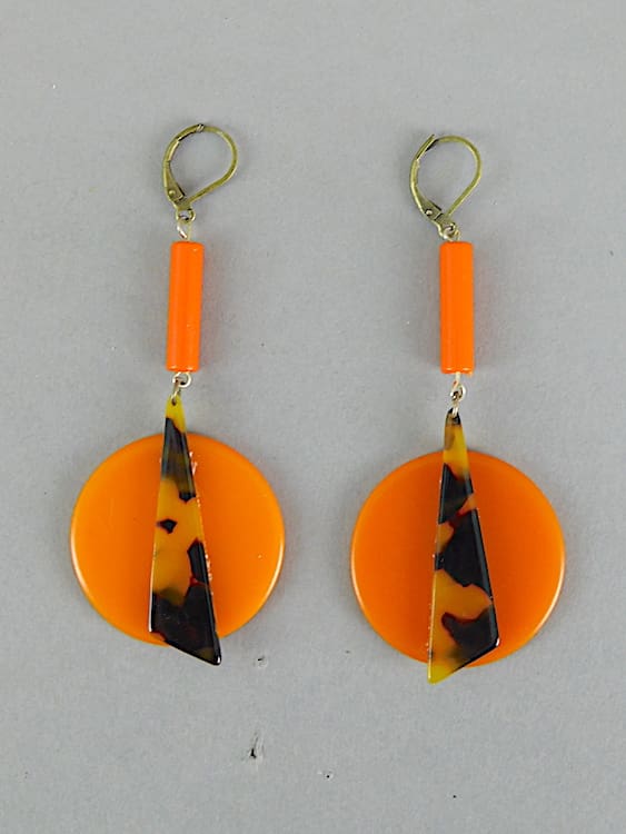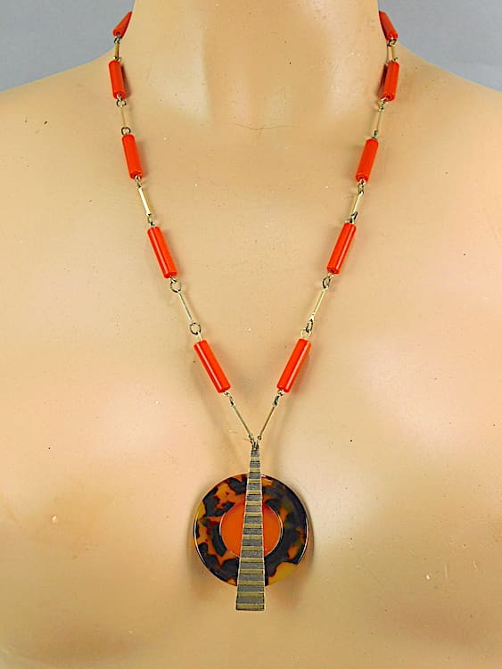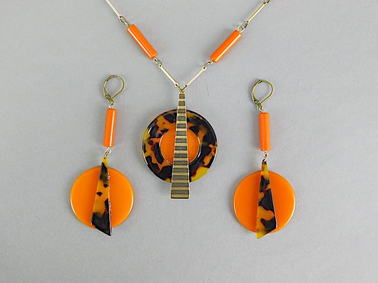 French Art Deco modernist orange and tortoiseshell phenolic necklace and earring set.