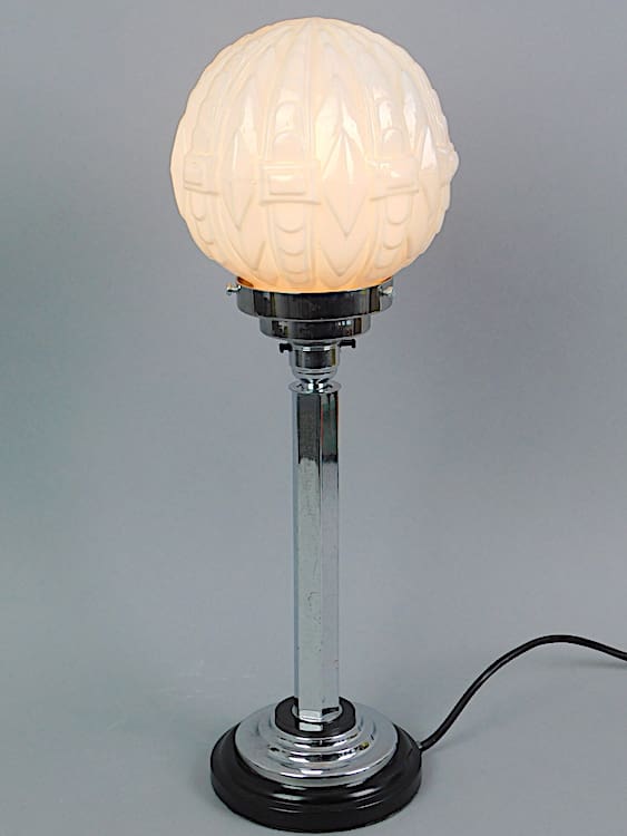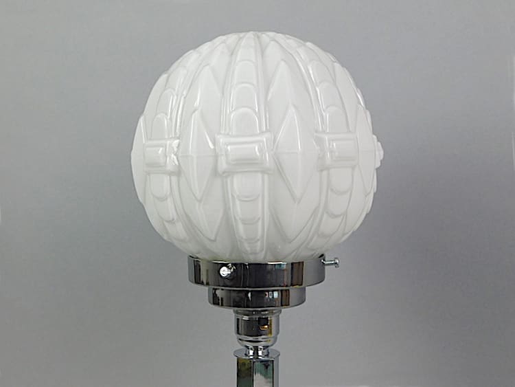English art deco chrome and black phenolic table lamp with Czechoslovakian white glass shade.