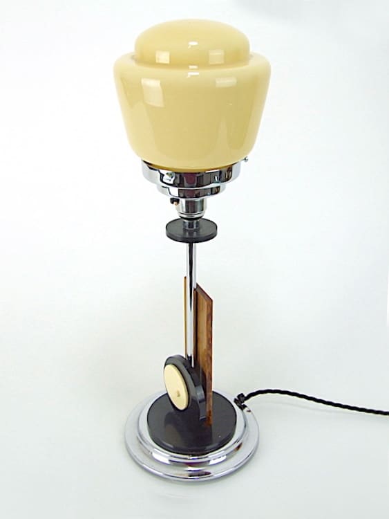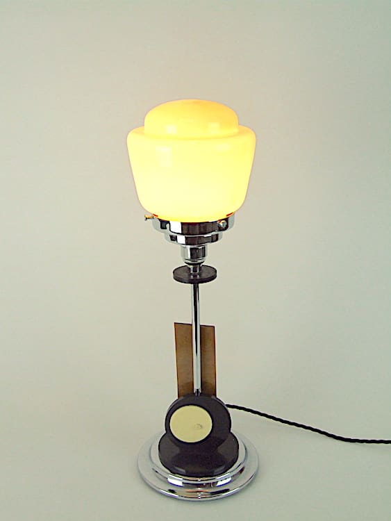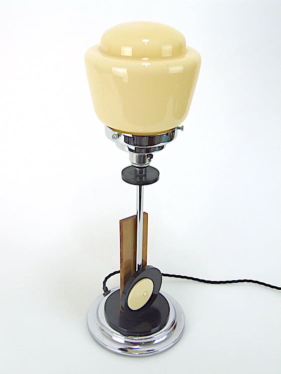 Modernist phenolic and chrome asymmetrical table lamp. Cream glass shade.
