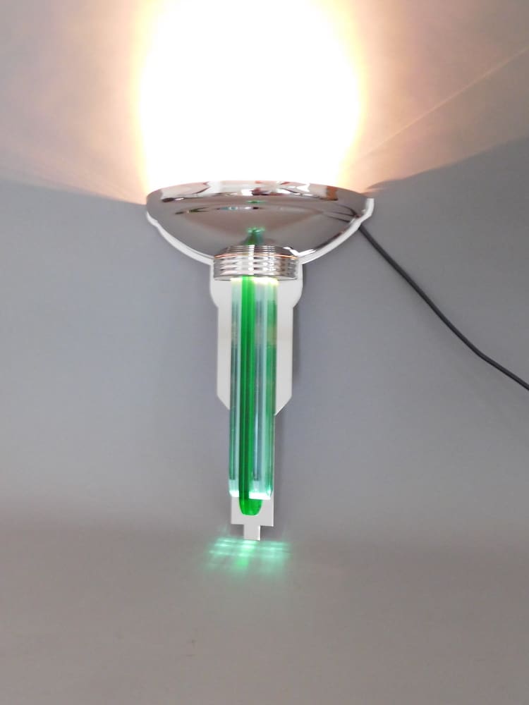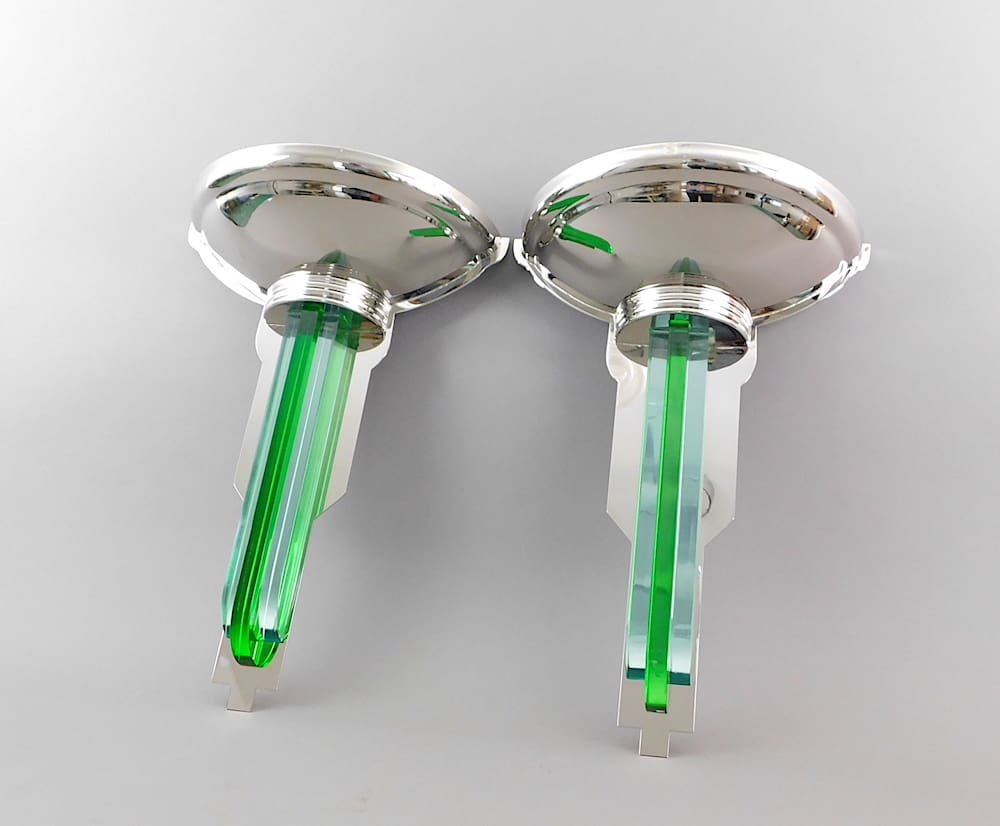 Pair of contemporary modernist art deco wall lights. Chromed metal cup uplighter with green glass shards that echo the light down the wall reflected by the chromed metal back panel.