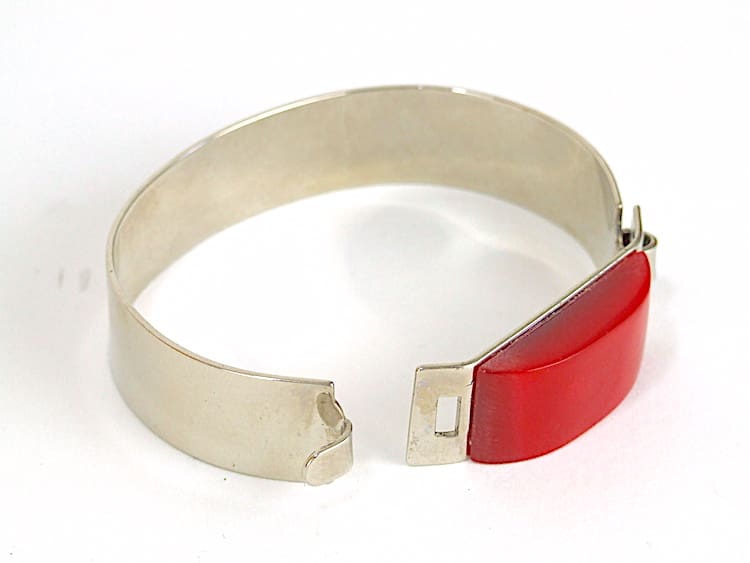 Red galalith and chrome art deco bangle. Made by Jakob Bengel in the early 1930s. This is an original old unsold stock item.