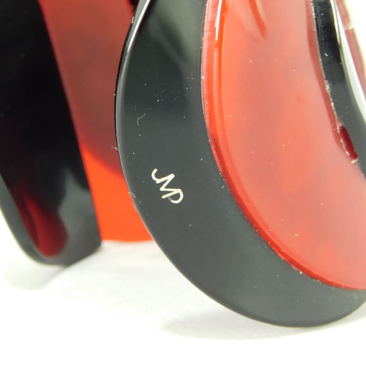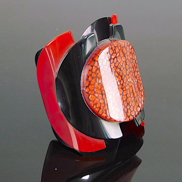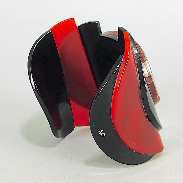 Stylish red and black cuff bangle with an open back for putting over the wrist.