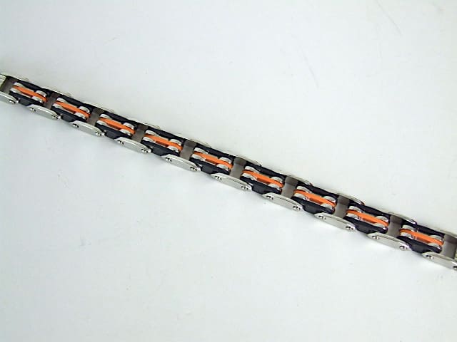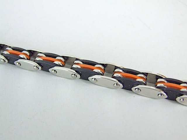 Vintage art deco stainless steel and phenolic multi link bracelet in black and orange. Marked Cobra and stainless steel to the clasp.