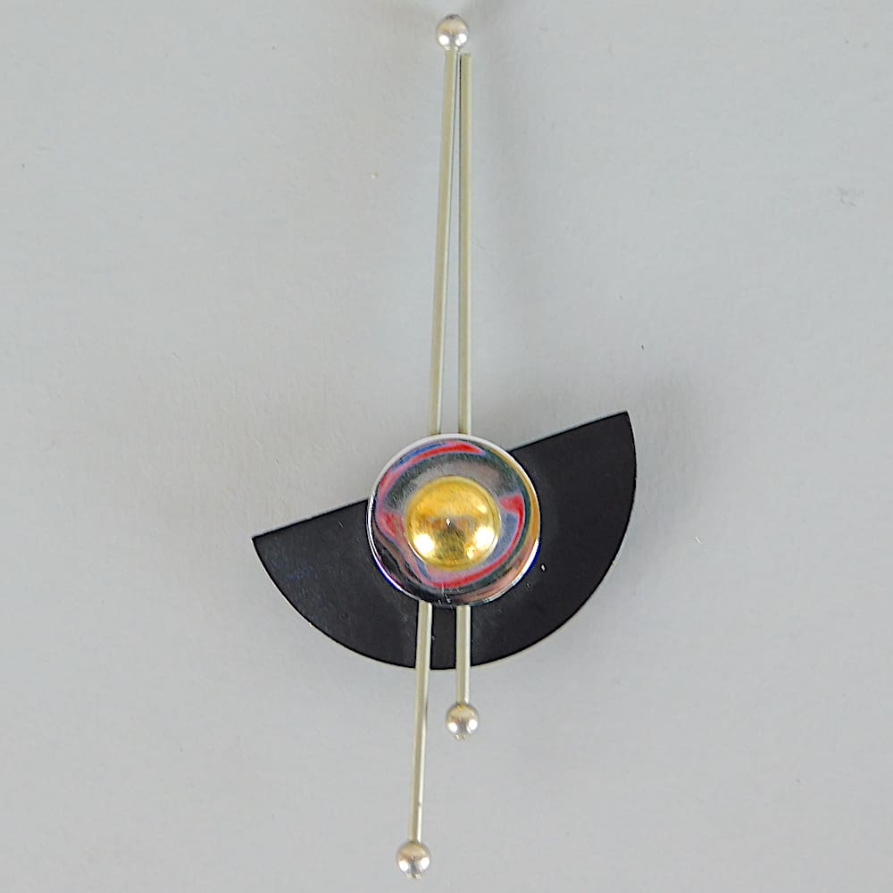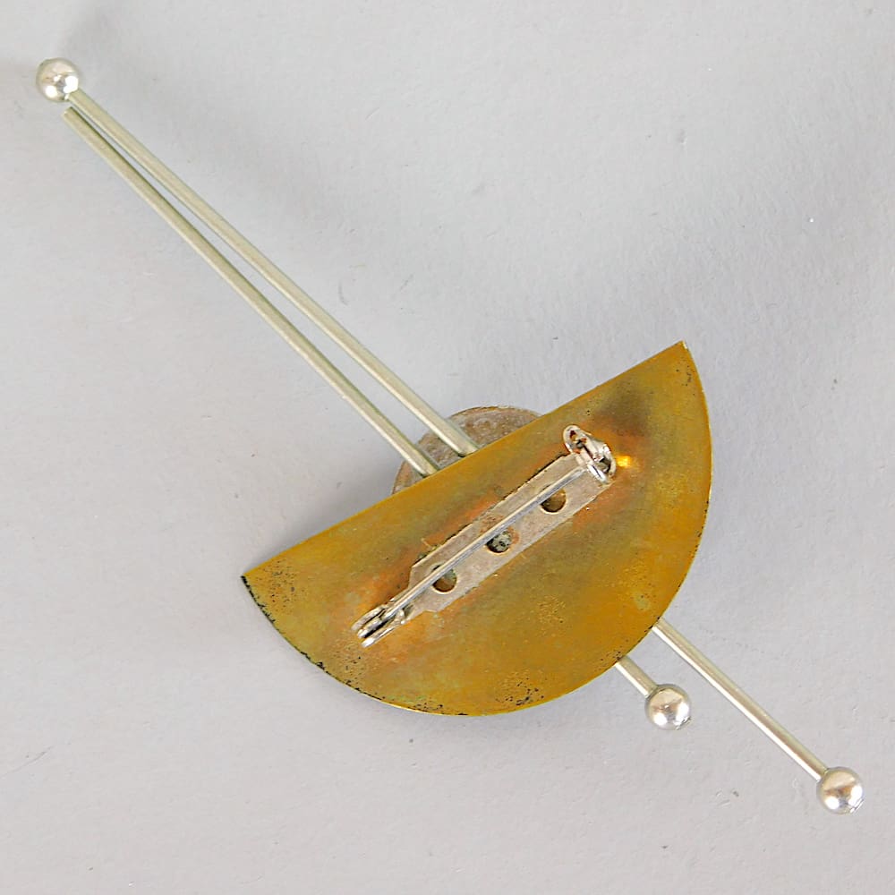 Vintage French modernist black galalith and metal brooch. Fitted with a roll safety clasp.