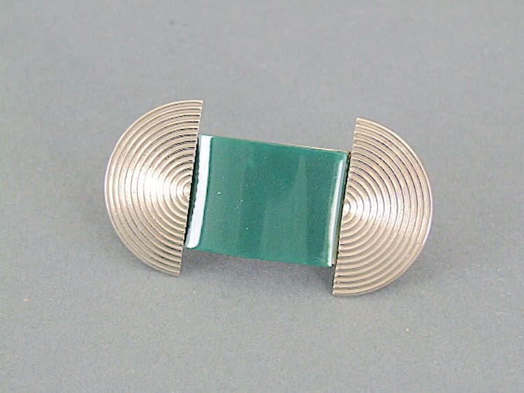Modernist brooch in chromed metal and green galalith. Made in the early 1930s by Jakob Bengel company. Fitted with a roll safety clasp and comes on it original card – unsold from new.