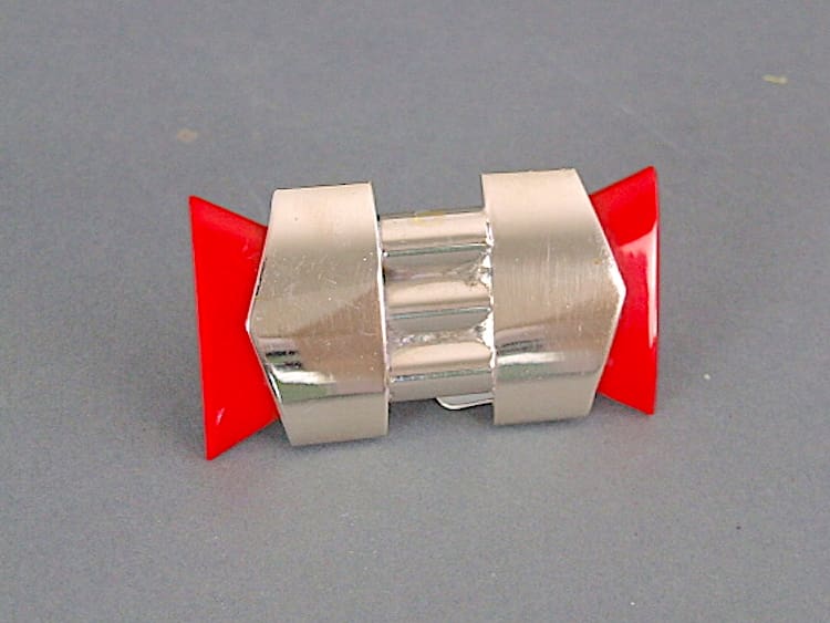 Modernist art deco brooch in chromed metal and navy galalith. Made in the early 1930s by Jakob Bengel company. Fitted with a roll safety clasp and comes on it original card.
